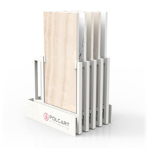 Compuesto de cajon inferior acabado en blanco con impresion directa en los laterales. 5 guias dobles extraibles, lacadas en blanco, para insertar piezas de 60x120 con sistema de giro 360º.